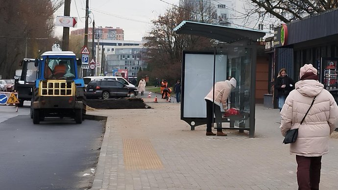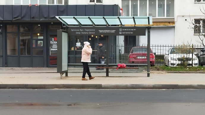 Відновлена зупинка громадського транспорту, яка була зруйнована внаслідок ДТП 18 листопада 2024 року, листопад 2025 року, Хмельницький. Суспільне Хмельницький
