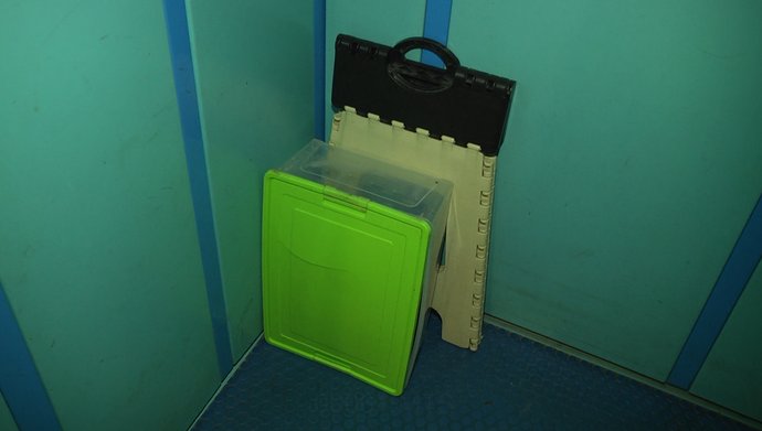 Стільчик та аварійний набір у ліфті багатоповерхівки, підготовлені на випадок його зупинки під час відключення світла, Хмельницький, листопад 2025 року. Суспільне Хмельницький