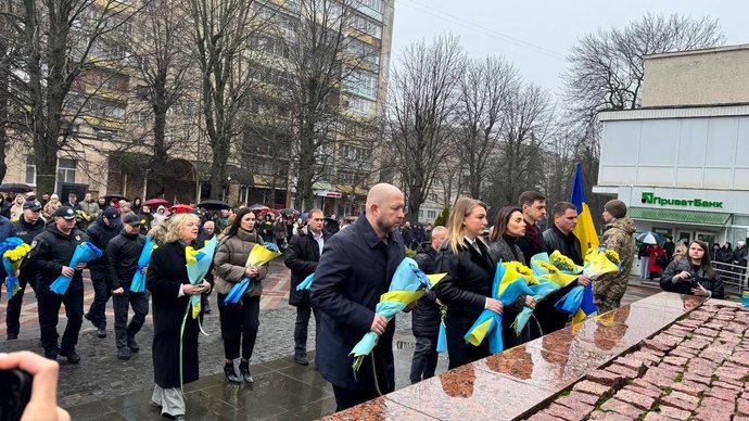 У Хмельницькому представники влади, силових структур та громади покладають квіти до меморіалу Героям Небесної Сотні з нагоди Дня Гідності та Свободи, 21 листопада 2025 року. Суспільне Хмельницький
