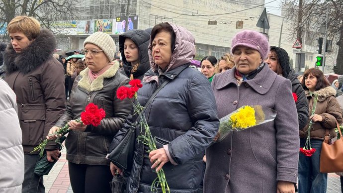 У Хмельницькому під час Дня Гідності та Свободи люди з квітами вшановують пам’ять Героїв Небесної Сотні, схиливши голови у спільній молитві, 21 листопада 2025 року. Суспільне Хмельницький
