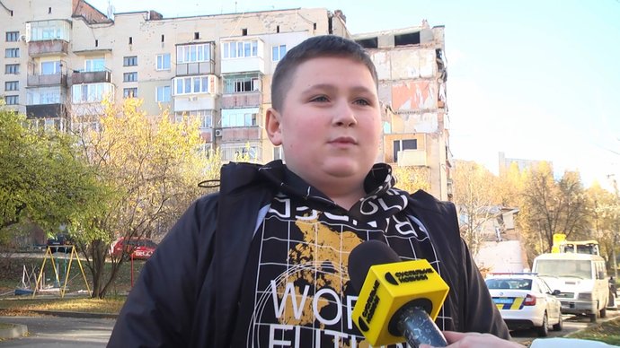 12-річний Глєб Дорощак був вдома, коли в будинку стався вибух, 31 жовтня 2025 року, Хмельницький. Суспільне Хмельницький"Почув слабкий вибух, наче щось впало на дворі, не придав значення. Потім сильний вибух. Вибило двері, впало скло. Собака побігла під ліжко, злякалася, я швидко вимкнув комп’ютер, взяв куртку і вибіг на двір".