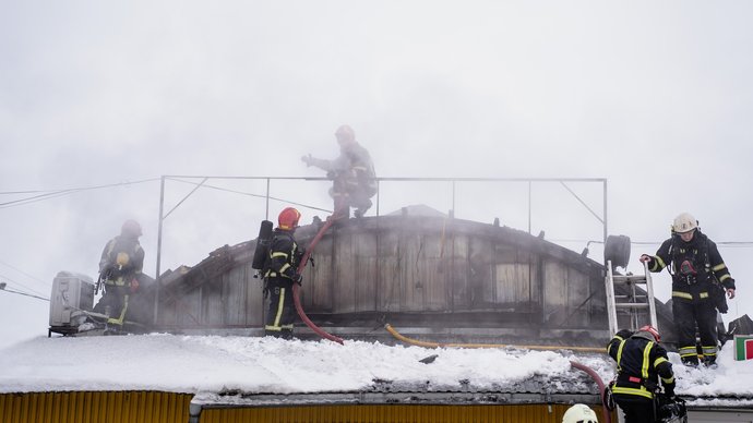 Рятувальники ДСНС на даху будівлі під час гасіння пожежі, 13 січня 2026 року, Хмельниччина. Пресслужба Головного управління ДСНС у Хмельницькій області