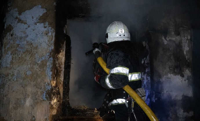 Рятувальник ДСНС гасить пожежу у будівлі, 13 січня 2026 року, Хмельниччина. Пресслужба Головного управління ДСНС у Хмельницькій області