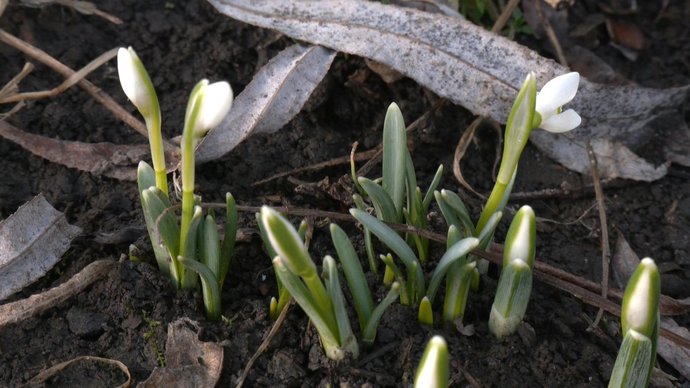 Перші підсніжники, що розквітли в ботсаду Хмельницького національного університету, 11 березня 2026 року. Суспільне Хмельницький
