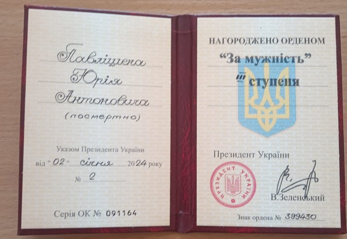 Дружина загиблого військовослужбовця Юрія Павлішена з Хмельниччини отримала державну відзнаку. Захисника посмертно нагородили орденом "За мужність" III ступеня.