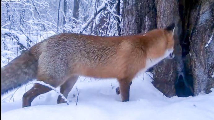 Лисиця у лісі маркує територію. Скрін з відео національного природного парку “Мале Полісся”