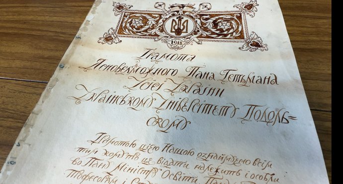 Оригінал вітальної грамоти гетьмана Павла Скоропадського з нагоди відкриття університету в Кам’янці-Подільському в 1918 році. Суспільне Хмельницький