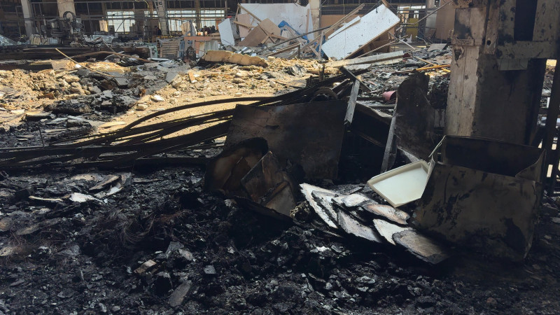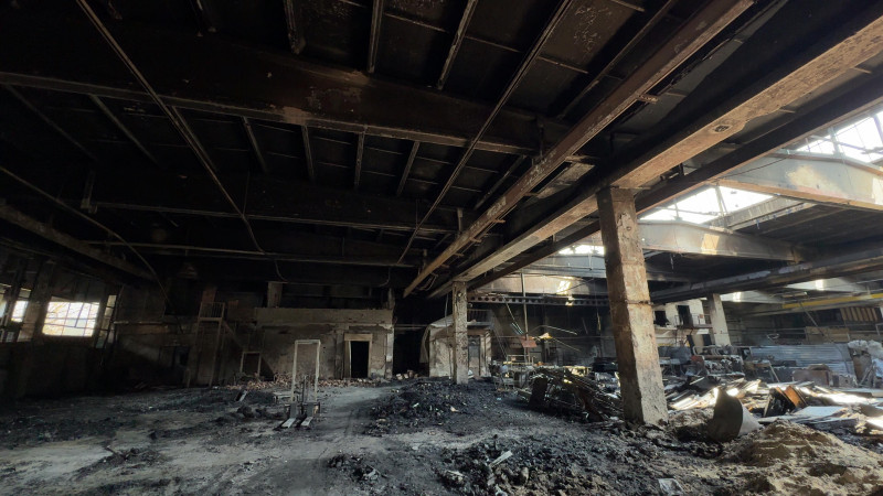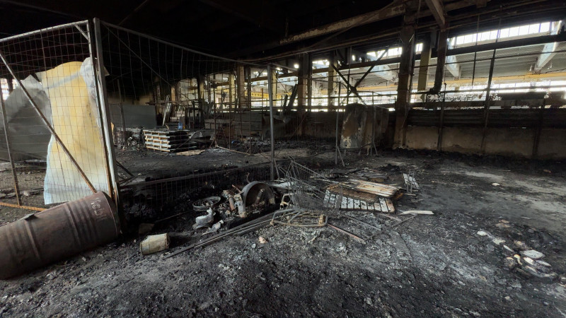 Пошкоджене майно та залишки обладнання всередині вигорілої будівлі, Хмельницький, квітень 2026 року. Суспільне Хмельницький