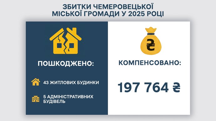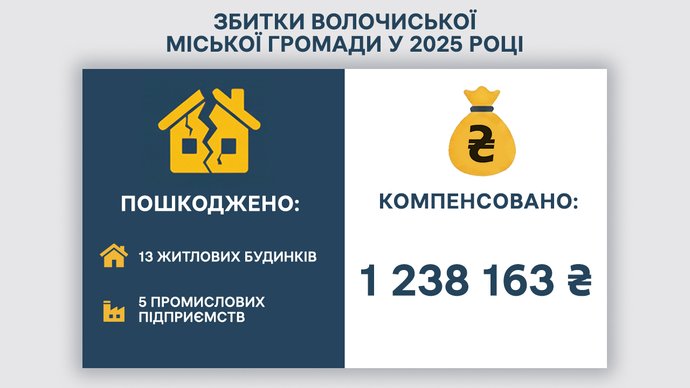 Волочиська міська громада повідомила про загальний обсяг матеріальних збитків у 2025 році на суму 16 мільйонів 980 тисяч 358 гривень. Було пошкоджено 13 житлових будинків та п'ять промислових підприємств. Наразі мешканцям компенсовано частину збитків у розмірі один мільйон 238 тисяч 163 гривні.