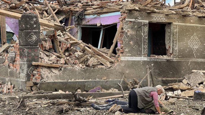 Жінка схилилася над тілом загиблого біля зруйнованого будинку внаслідок російського обстрілу Дунаєвецької громади, Хмельниччина, 20 вересня 2025 року. Суспільне Хмельницький