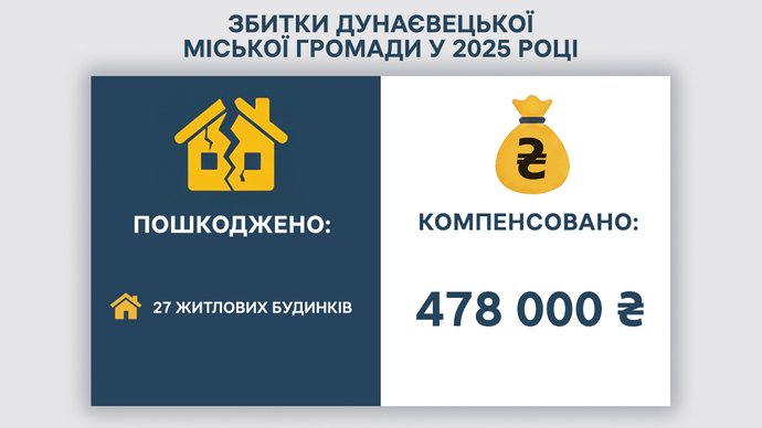 Дунаєвецька міська громада повідомила, що у 2025 році внаслідок ракетних обстрілів було знищено два садибні будинки та пошкоджено 27 житлових будинків. Станом на січень 2026 року відновлено 25 будинків. Мешканцям надано фінансову допомогу з бюджету громади на суму 478 тисяч гривень. Офіційна оцінка збитків не проводилась.