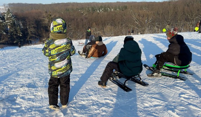 Люди катаються на санчатах та льодянках, січень 2026 року, Хмельницький. Суспільне Хмельницький
